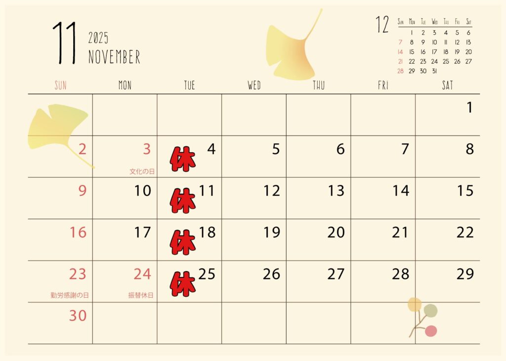 定休日 2025年11月1日 最終更新日時 : 2025年11月1日 phm83490 11月の定休日です 毎年ごとに夏が長くなり すぐ冬の気候になりますね 体調管理が難しくなってます 年末までもう少しです 早めのご予約をお勧めします \ 最新情報をチェック /